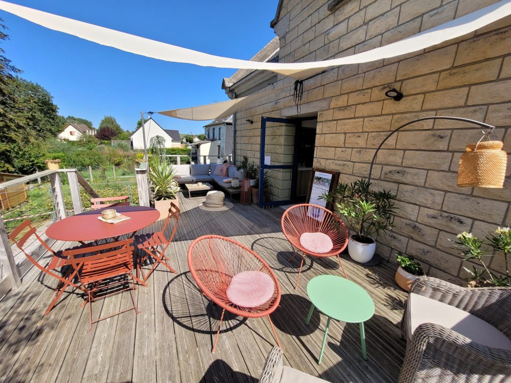 Pour ceux qui ont envie de prendre un peu de temps, le lieu permet de s’installer confortablement sur la terrasse aménagée en salon d’été. D’ici, vous apprécierez la vue sur les vestiges du château de Picquigny et sur le fleuve. Dans le jardin, un terrain de pétanque et des jeux en bois invitent à partager des moments simples et conviviaux.